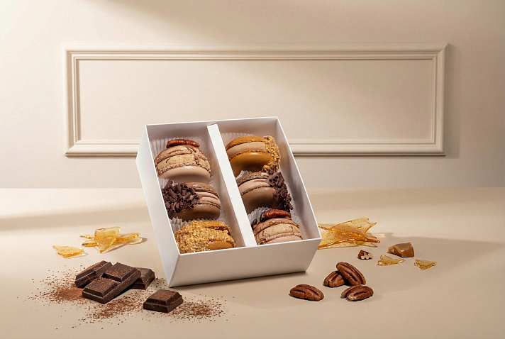 WOW макарон лимитированной новогодней коллекции. Взбитый в пену шоколадный ганаш с добавлением кофейного крема и фирменной соленой карамели. Пирожное декорировано густой шоколадной глазурью, кофейными зернами и орехами пекан. Объемное пирожное макарон дарит ощущение целого торта в одном пирожном, насыщенный индивидуальный орехово-шоколадный пир и праздник!