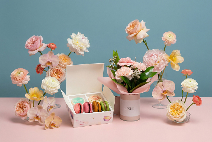 Эта композиция объединяет живые цветы, изящные макароны и стильные детали — для нежного подарка с весенним настроением.