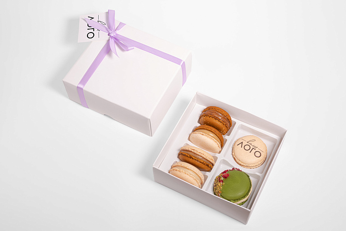 6 пирожных в упаковке из белого картона, 1 нанесение логотипа или любого другого изображения, бирка с вашим логотипом и лента в корпоративных цветах