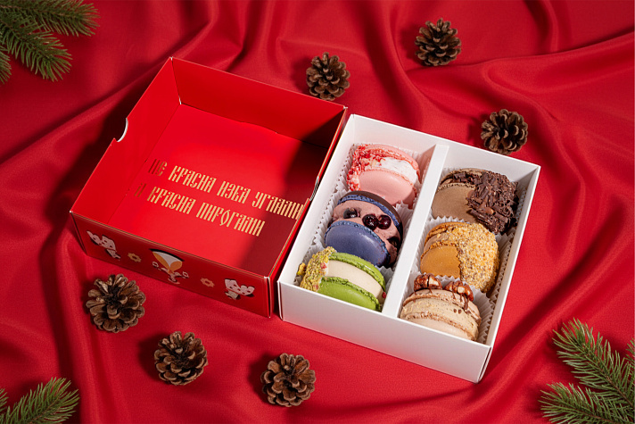 WOW макарон лимитированной новогодней коллекции. Взбитый в пену молочный шоколад с нежнейшими сливками и натуральной черной смородиной — эта игра кислого и сладкого, терпкого и нежного вкусов — подобно смеси эмоций от теплого уюта родного дома и заснеженных пышных шапок снега за окном. Миндальный десерт, дарящий бурю противоречивых, но таких счастливых эмоций, облачен в шоколадную глазурь и декор из сублимированной ягоды в посыпке из измельчённой в кристаллы смородины.