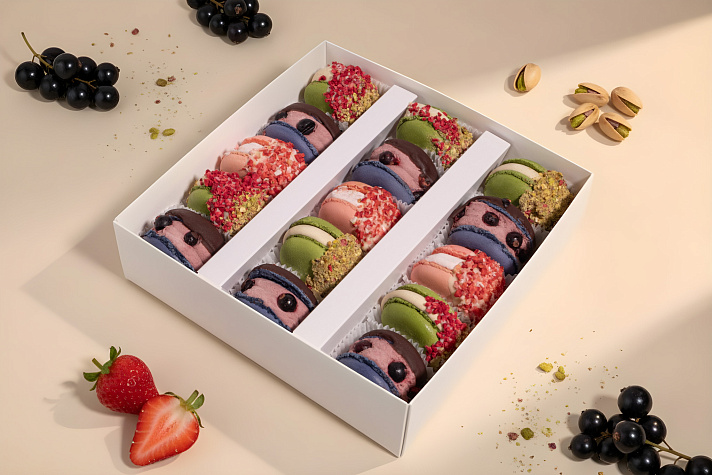 WOW макарон лимитированной новогодней коллекции. Взбитый в пену молочный шоколад с нежнейшими сливками и натуральной черной смородиной — эта игра кислого и сладкого, терпкого и нежного вкусов — подобно смеси эмоций от теплого уюта родного дома и заснеженных пышных шапок снега за окном. Миндальный десерт, дарящий бурю противоречивых, но таких счастливых эмоций, облачен в шоколадную глазурь и декор из сублимированной ягоды в посыпке из измельчённой в кристаллы смородины.