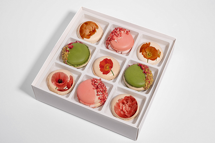 Этот набор — как праздничный букет, только вкуснее! Девять изысканных макарон, украшенных цветочными принтами и яркими WOW-пирожными, произведут впечатление с первой же секунды. Нежные оттенки, воздушный вкус и весеннее волшебство — лучший способ сказать «Ты прекрасна!»
