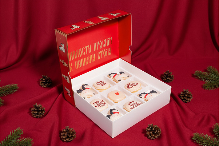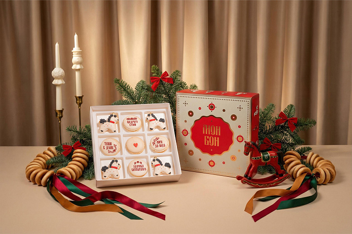 Внутри девять макаронов, которые будто сошли с новогоднего стола: четыре нарядных коня в духе дымковской игрушки и четыре пирожных с добрыми пожеланиями: «Тепла в доме», «Щедрого стола», «Здоровья богатырского» и «Мира да Лада». А в центре макарон с сердцем, потому что всё начинается с любви.