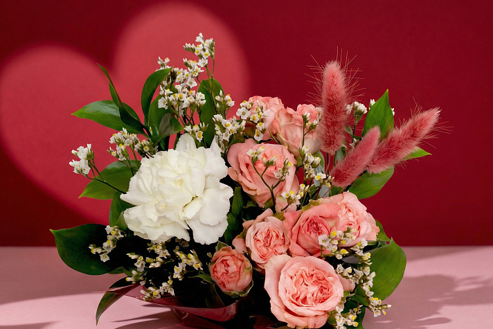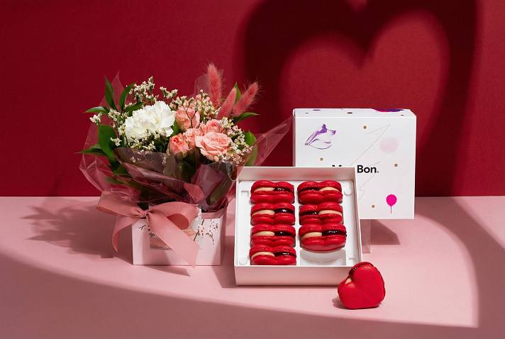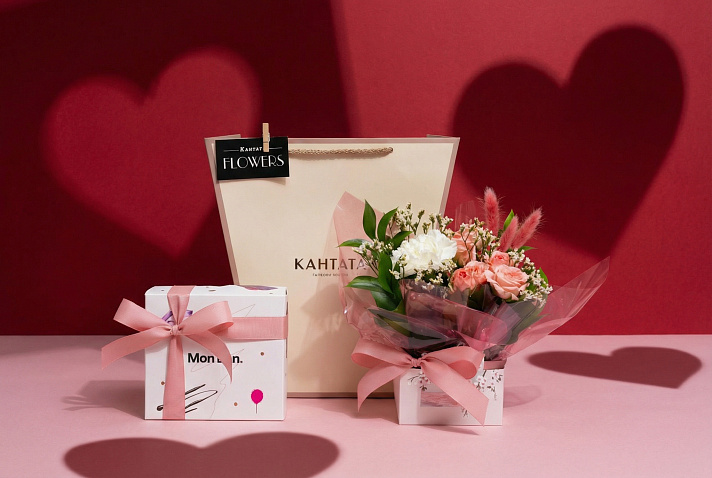Нежный подарочный набор, в котором каждая деталь говорит о чувствах. Внутри — восемь изящных монбонов в форме сердец с выразительными начинками, дополненные живой цветочной композицией в фирменной упаковке Кантаты.