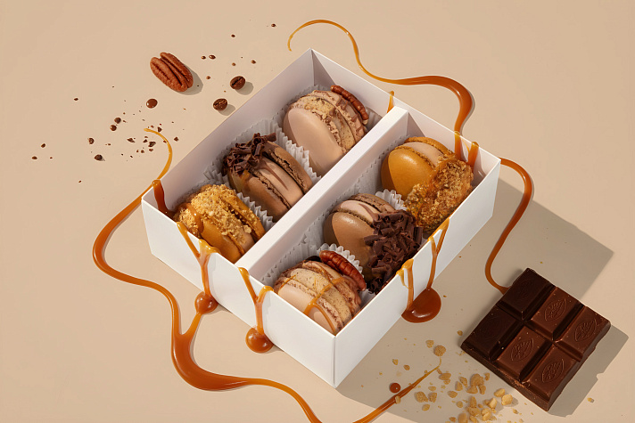 WOW макарон лимитированной новогодней коллекции. Взбитый в пену шоколадный ганаш с добавлением кофейного крема и фирменной соленой карамели. Пирожное декорировано густой шоколадной глазурью, кофейными зернами и орехами пекан. Объемное пирожное макарон дарит ощущение целого торта в одном пирожном, насыщенный индивидуальный орехово-шоколадный пир и праздник!