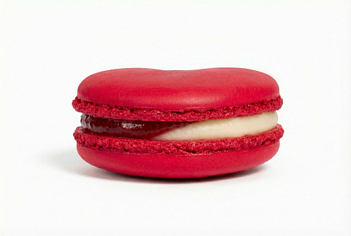 Нежные миндальные половинки с бархатной текстурой скрывают внутри сливочный ванильный крем и конфитюр с натуральной земляникой — ягодный, мягкий, с той самой лёгкой кислинкой, которая делает вкус живым и запоминающимся.