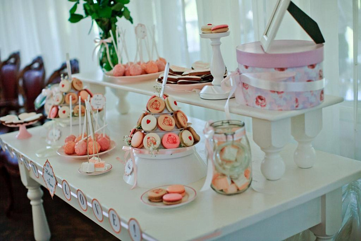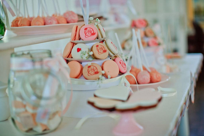 Данный кенди-бар стал украшением на свадьбе молодой пары. Главное пожелания молодожен — оформление в нежно-розовом оттенке свадьбы. Мы подобрали сладости в цветовой гамме мероприятия, на пирожные макарон была нанесена монограмма, а на пряниках вручную написаны имена.
