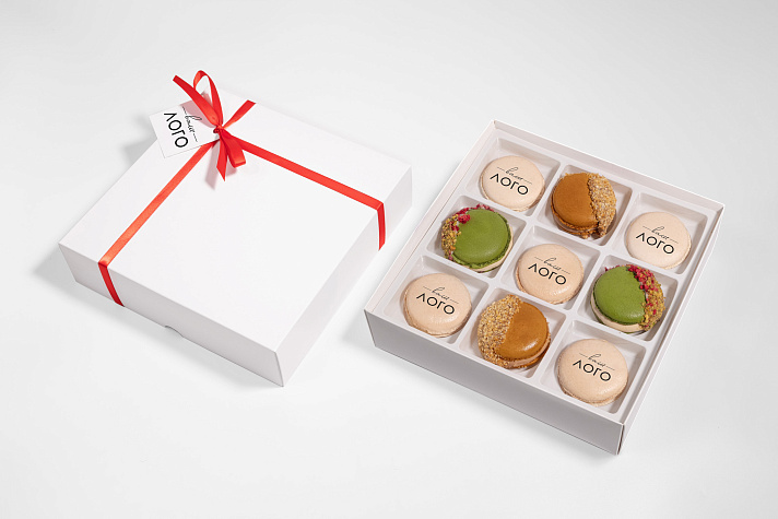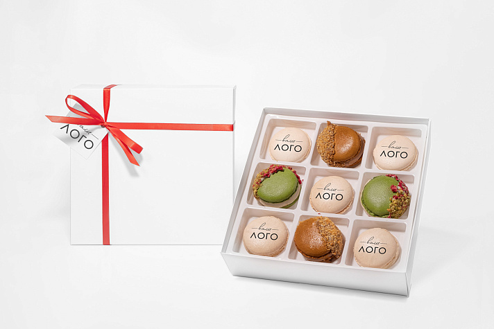 9 пирожных в качественной белой коробке, 5 нанесений логотипа или любого изображения на пирожное, бирка с вашим логотипом и лента в корпоративных цветах