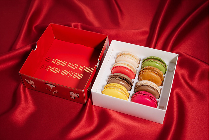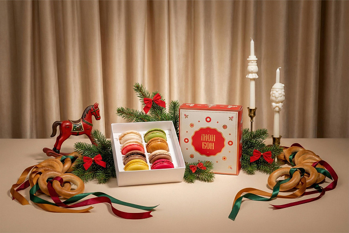 Внутри 8 пирожных макаронов из классической линейки Mon Bon: любимые вкусы, новогодние цвета и безупречная текстура. Это ассорти словно собрано из разных глав зимней сказки, для тех, кто любит удивляться и угощать.