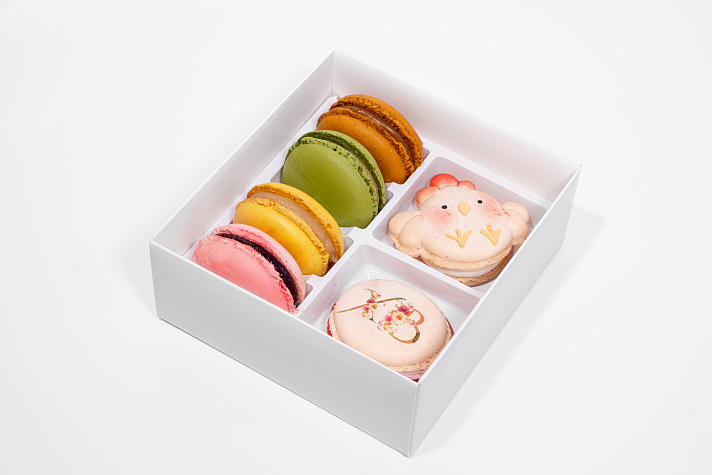Внутри нежные классические макароны и милые фигурные макароны в виде цыплёнка и зайки, который сразу создаёт пасхальное настроение.