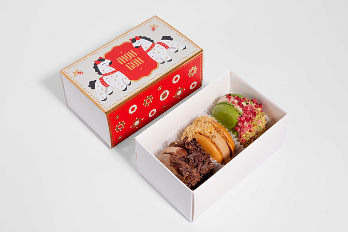 Коробка оформлена в духе всей коллекции: с элементами дымковской росписи и золотыми акцентами.