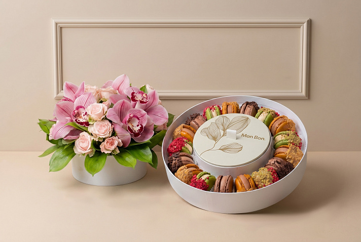 Композицию дополняет букет из орхидей и кустовой розы — элегантный, утончённый, с ощущением праздника.