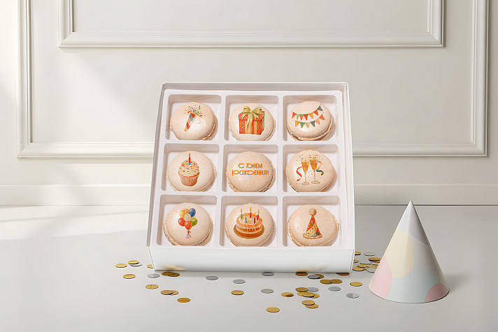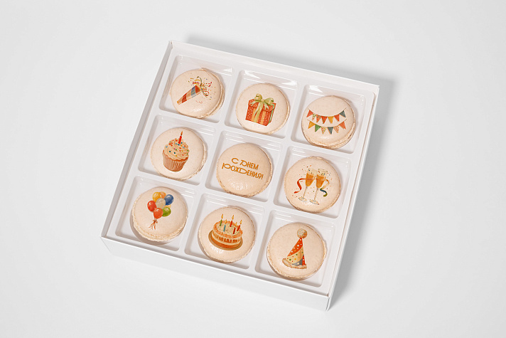 Какой именинник без персональных сладостей? Ассорти пирожных макарон с праздничными иллюстрациями развлечет, поздравит и осчастливит одновременно!