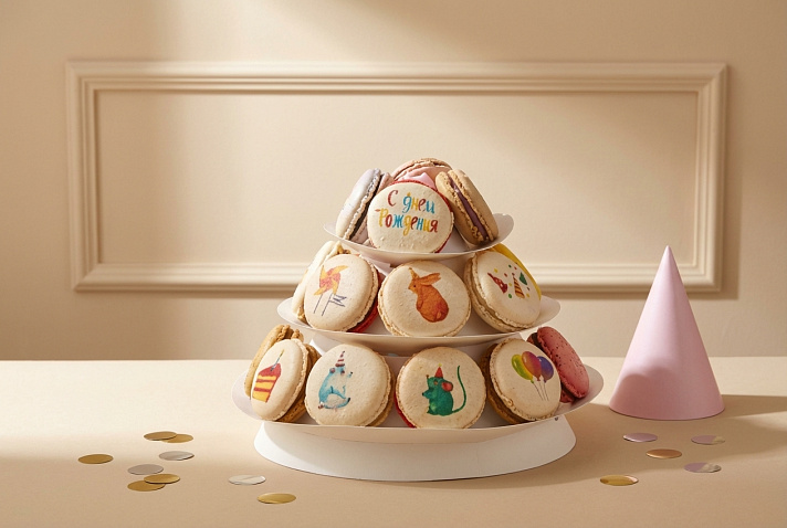 Какой именинник без персональных сладостей? Ассорти пирожных макарон с праздничными иллюстрациями развлечет, поздравит и осчастливит одновременно!